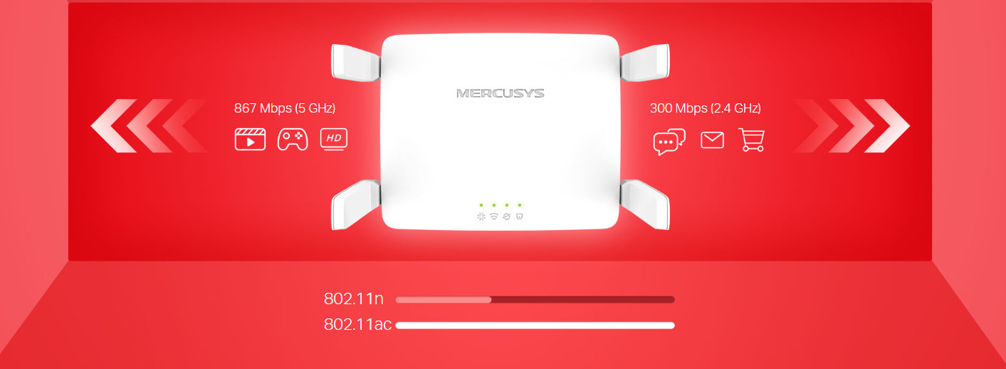 Wi-Fi Tốc Độ Cao – Kết nối nhanh và ổn định, tốc độ đạt tới 1167 Mbps (300 Mbps trên băng tần the 2.4 GHz và 867 Mbps trên băng tần 5 GHz)