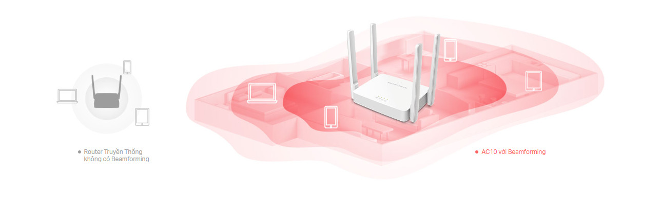 Bốn ăng-ten 5dBi bên ngoài được hỗ trợ bằng công nghệ ăng-ten tiên tiến cung cấp cho người dùng vùng phủ sóng không dây lớn hơn trong nhà hoặc văn phòng của bạn. Với sự kết hợp của Công nghệ Beamforming, AC10 có thể phát hiện vị trí của các thiết bị được kết nối của bạn và tập trung cường độ tín hiệu không dây về phía chúng, giúp kết nối của bạn ổn định hơn.