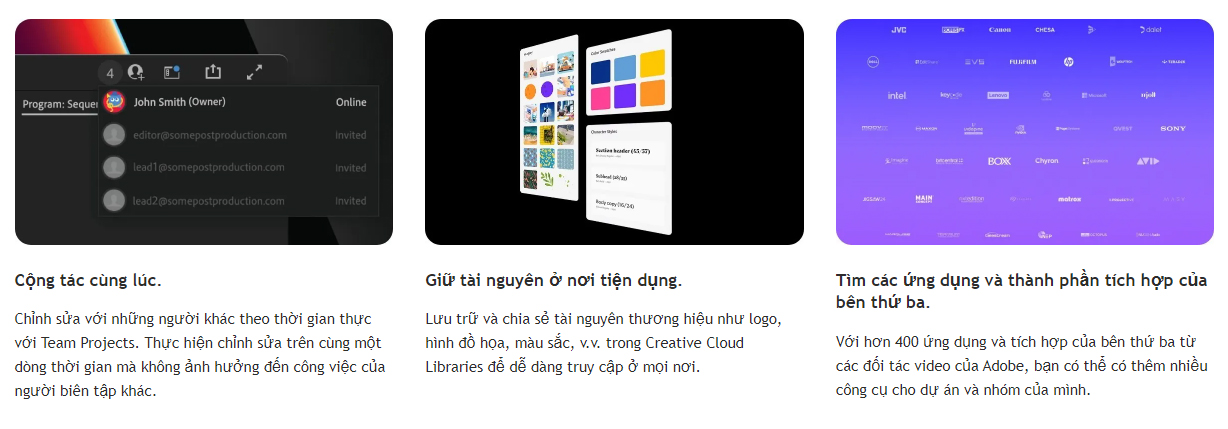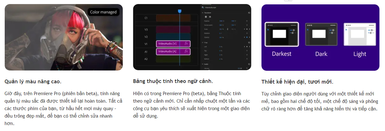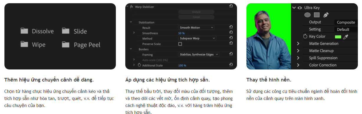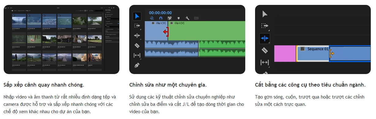 Nhận phần mềm biên tập video đầu ngành cho phim, truyền hình và web. Công cụ sáng tạo, tích hợp với các ứng dụng và dịch vụ khác của Adobe và sức mạnh của Adobe Sensei giúp bạn tạo cảnh quay thành thước phim và video bóng bẩy theo một quy trình làm việc liền mạch.