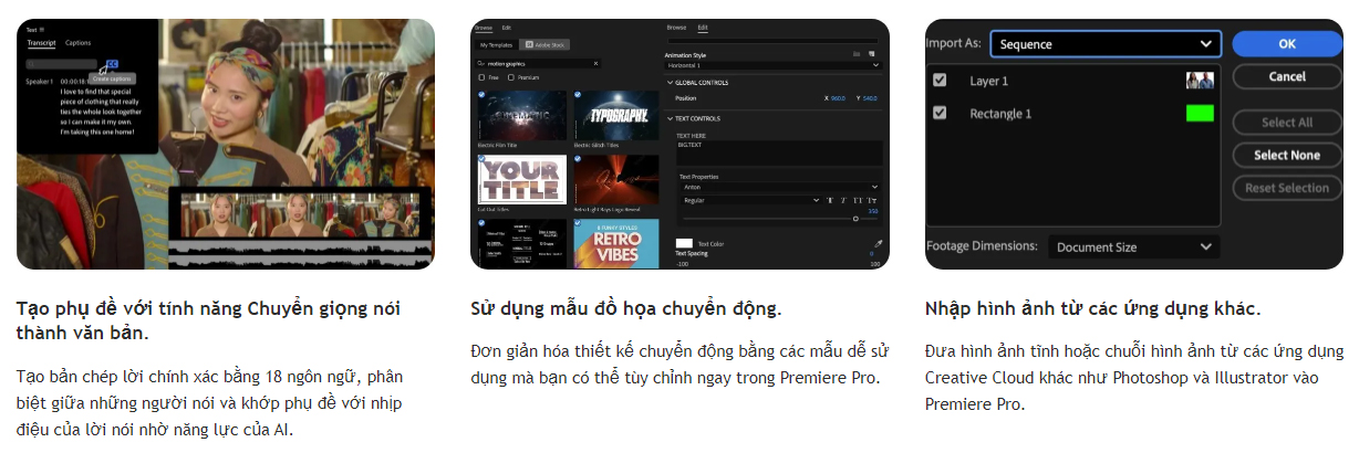 Tạo tiêu đề, hình đồ họa và phụ đề hấp dẫn một cách nhanh chóng và dễ dàng mà không cần rời khỏi Premiere Pro.