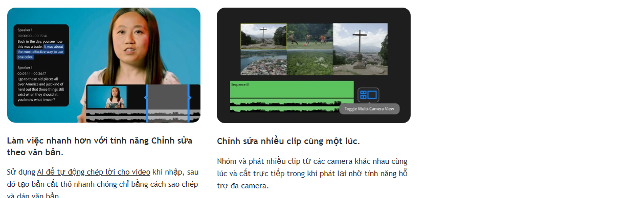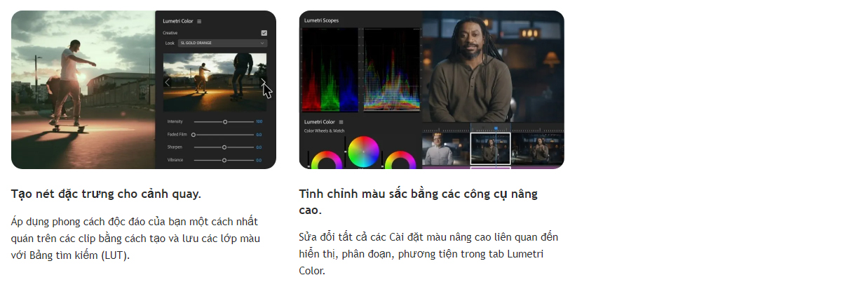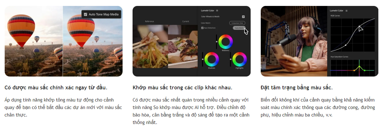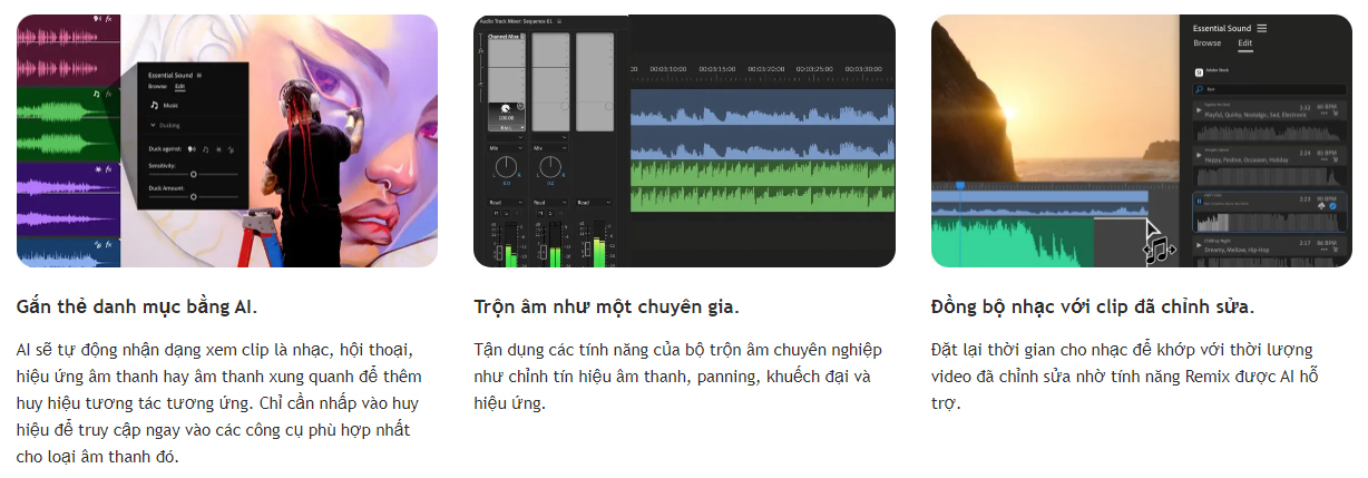 Premiere Pro có rất nhiều tính năng AI đến từ công nghệ Adobe Sensei — chẳng hạn như Color Match, Auto Ducking và Morph Cut — bạn có thể bỏ qua những nhiệm vụ tẻ nhạt và dành nhiều thời gian hơn để sáng tạo.