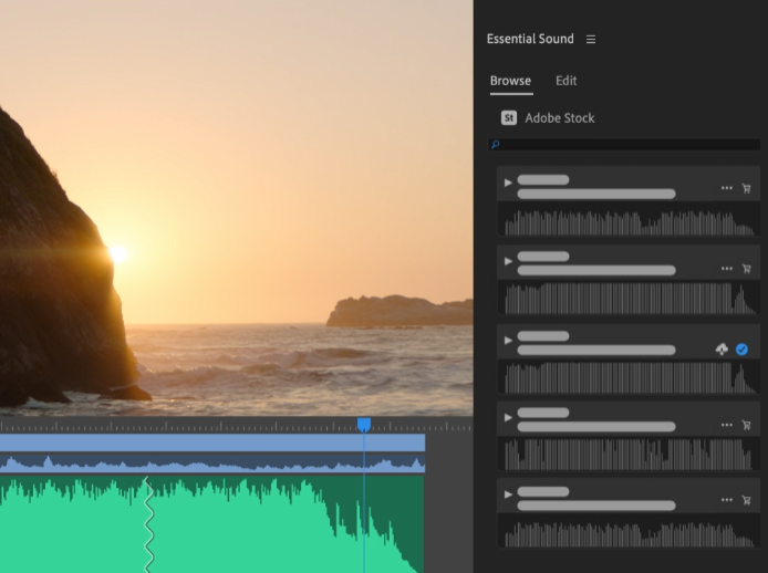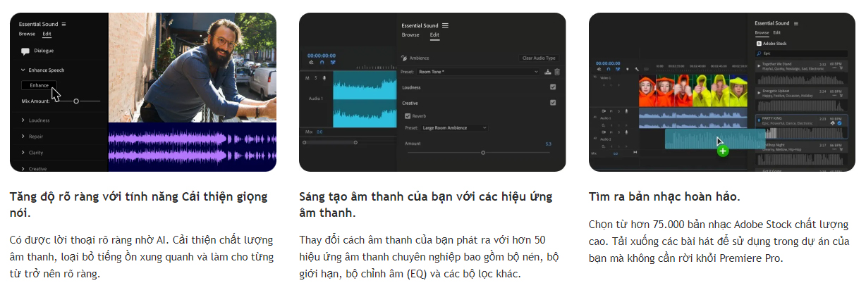 Giảm tiếng ồn và nâng cao chất lượng hội thoại bằng các công cụ âm thanh chuyên nghiệp, cũng như bổ sung các hiệu ứng nâng cao khi bạn đã có những bước tiến trong lĩnh vực thiết kế âm thanh. Duyệt xem các bản nhạc, sử dụng AI để tự động chèn khớp vào clip của bạn rồi cấp giấy phép – tất cả đều có trong Premiere Pro.