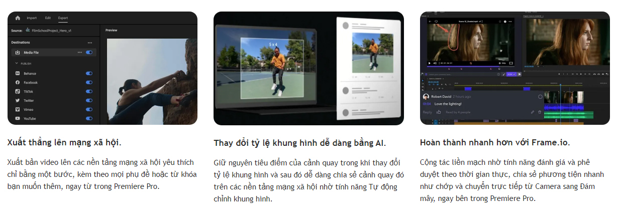 Nhận phản hồi từ cộng tác viên thông qua Frame.io – phản hồi này được tích hợp vào Premiere Pro và là một phần trong gói đăng ký Creative Cloud của bạn. Tự động chỉnh khung hình video thành phẩm để phù hợp với các nền tảng dọc, dễ dàng xuất sang YouTube, Vimeo và Facebook, hoặc sử dụng các tùy chọn thiết lập sẵn của riêng bạn.