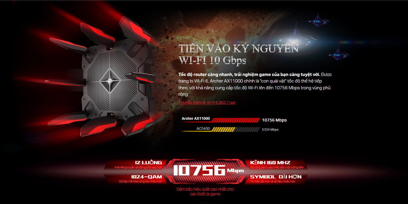 Router Chơi Game Nhanh Nhất – Cỗ máy tốc độ AX11000 cung cấp Wi-Fi lên đến hơn 10 Gbps: 4804 Mbps (5 GHz Gaming) + 4804 Mbps (5 GHz) + 1148 Mbps (2.4 GHz)