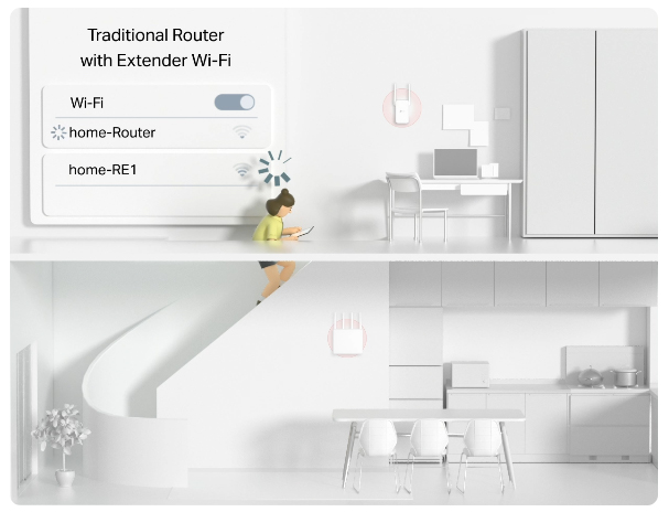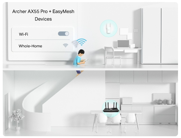 Archer AX55 Pro tương thích với EasyMesh. Nếu có vùng chết Wi-Fi trong nhà, chỉ cần thêm thiết bị EasyMesh để mở rộng vùng phủ sóng Wi-Fi Multi-Gigabit. Không còn cảnh tìm kiếm tín hiệu ổn định.◇