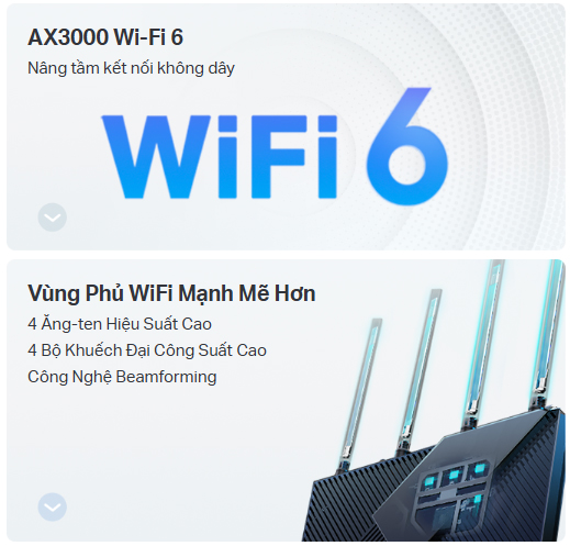‡ Việc sử dụng 802.11ax (Wi-Fi 6) và các tính năng như OFDMA, 1024-QAM, HE160 và TWT yêu cầu thiết bị khách cũng phải hỗ trợ các tính năng tương ứng. Băng thông 160 MHz có thể không khả dụng trên băng tần 5 GHz tại một số khu vực/quốc gia do giới hạn quy định. Tốc độ dữ liệu gấp đôi đề cập đến 160 MHz so với 80 MHz trên các router Wi-Fi 6 thông thường.