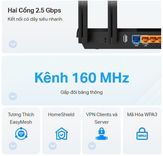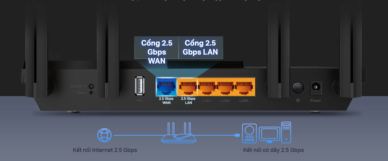 - Hai Cổng 2.5 Gbps Multi-Gigabit: 1× cổng WAN 2.5 Gbps + 1× cổng 2.5 Gbps + 3× cổng LAN Gigabit + 1× cổng USB, đảm bảo linh hoạt tối đa và tốc độ vượt trội.