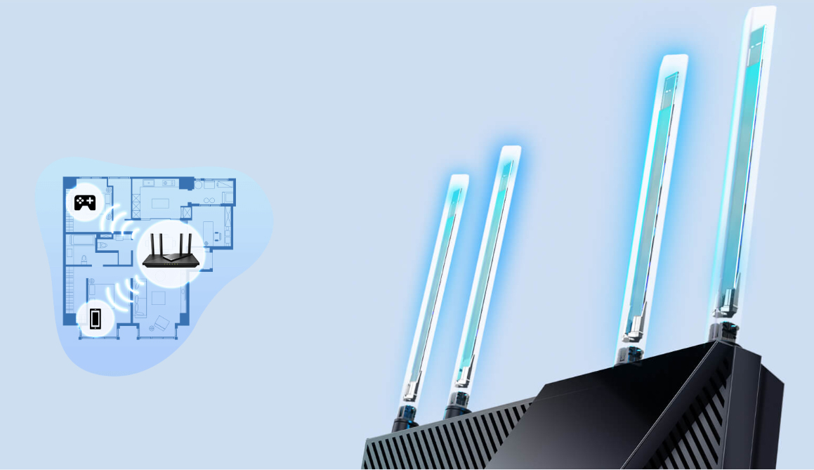 4 ăng-ten hiệu suất cao tăng cường tín hiệu Wi-Fi trong toàn bộ ngôi nhà. Công nghệ Beamforming phát hiện thiết bị và tập trung tín hiệu đến chúng, đặc biệt là ở những khu vực khó tiếp cận trước đây.