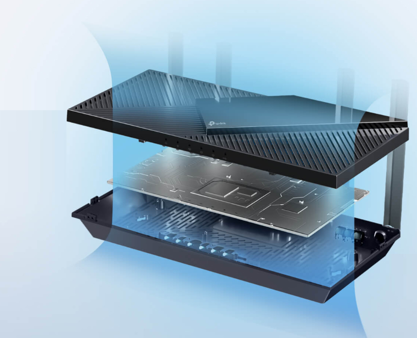 Không quá nhiệt, không giảm hiệu suất. Bộ tản nhiệt lớn hơn và thiết kế vỏ tinh chỉnh giúp hệ thống Wi-Fi 6 luôn hoạt động ổn định ở tốc độ tối đa.