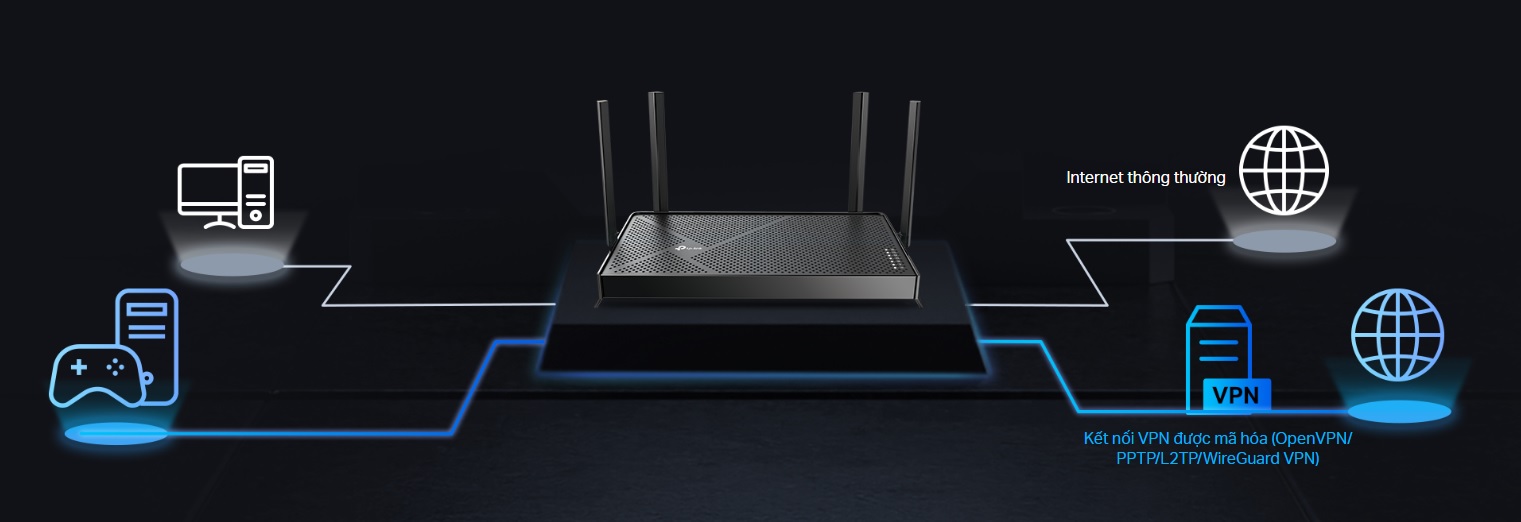 Archer BE230 cho phép các thiết bị trong mạng gia đình của bạn truy cập các máy chủ VPN từ xa mà không cần cài đặt phần mềm VPN trên mọi thiết bị. Archer BE230 router Wi-Fi 7 có thể chạy đồng thời cả VPN và kết nối internet thông thường, mang đến sự bảo mật và linh hoạt.