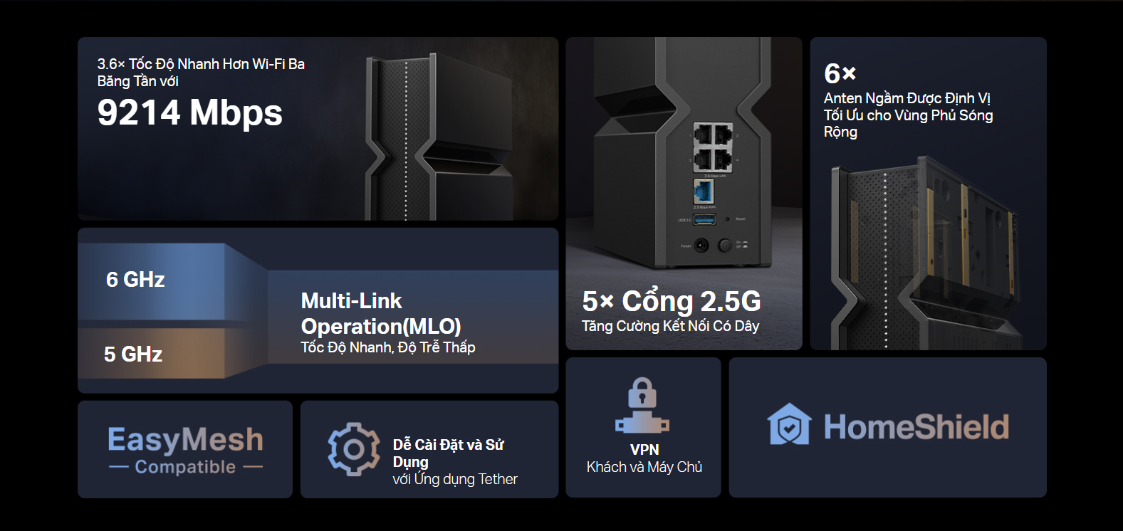 §Việc sử dụng WiFi 7 (802.11be), WiFi 6 (802.11ax) và các tính năng bao gồm MLO, Băng thông 320 MHz, 4K-QAM, Multi-RU, OFDMA và MU-MIMO yêu cầu máy khách hcũng phải hỗ trợ các tính năng tương ứng.
