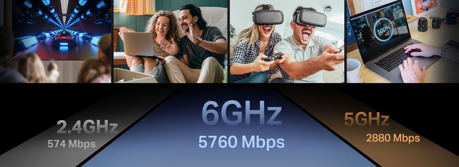 ◇Băng thông 320 MHz chỉ khả dụng trên băng tần 6 GHz. Đồng thời, băng thông 320 MHz trên băng tần 6 GHz và băng thông 160 MHz trên băng tần 5 GHz có thể không khả dụng ở một số vùng/quốc gia do các hạn chế về quy định. Độ rộng và tốc độ kênh đôi đề cập đến 320 MHz so với 160 MHz đối với router WiFi 6.