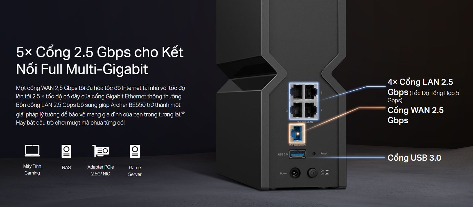 ☆Tốc độ internet 2,5 Gbps yêu cầu các gói dịch vụ và thiết bị tương thích. Tốc độ internet thực tế bị giới hạn bởi truy cập băng thông internet từ Nhà cung cấp dịch vụ Internet.