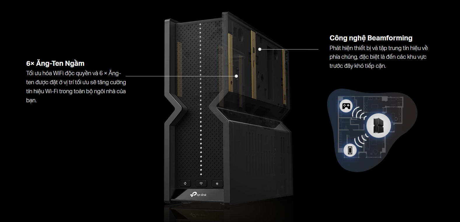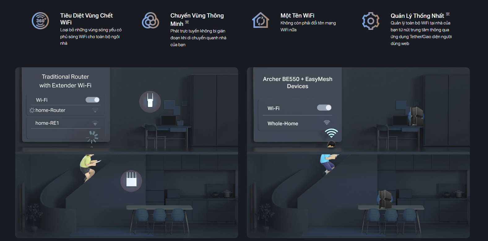 - Tương Thích EasyMesh: Hoạt động với router EasyMesh và bộ mở rộng sóng để tạo thành Mesh WiFi liền mạch cho toàn bộ ngôi nhà, ngăn chặn hiện tượng rớt và lag khi di chuyển giữa các tín hiệu.