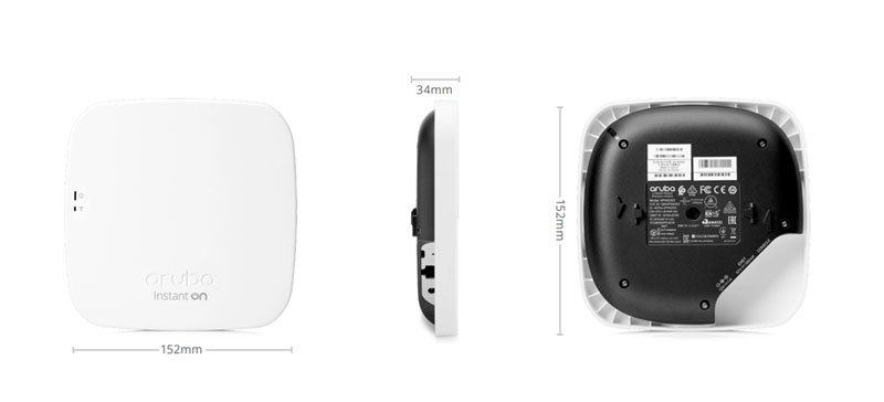 Aruba Instant On AP11 (R2W96A) có thiết kế nhỏ gọn với kích cỡ là 152mm x 152mm x 34mm. Thiết bị có hình vuông, các cạnh được bo cong mềm mại tạo cảm giác hiện đại, sang trọng. Màu sắc chủ đạo của R2W96A là màu trắng và màu đen. Mặt trước thiết bị nổi bật với phần logo Aruba Instant On được in sắc nét, bắt mắt; cụm đèn LED thông báo trạng thái hoạt động của thiết bị.
