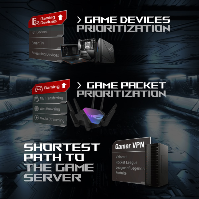 GT-AXE16000 tăng tốc lưu lượng game của bạn từ máy tính cá nhân đến máy chủ game. Tăng tốc game ba cấp độ độc quyền ổn định kết nối của bạn để ngăn chặn hiện tượng giật, giảm lag, giảm ping và tăng tốc độ trải nghiệm chơi game tuyệt vời.
