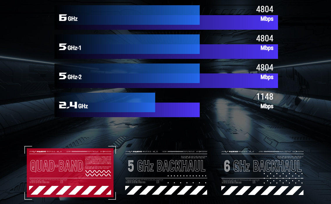 - Bộ định tuyến chơi game WiFi 6E quad-band đầu tiên trên thế giới - Định tuyến WiFi quad-band siêu nhanh 6E (802.11ax) cải thiện tốc độ lên đến 16000 Mbps