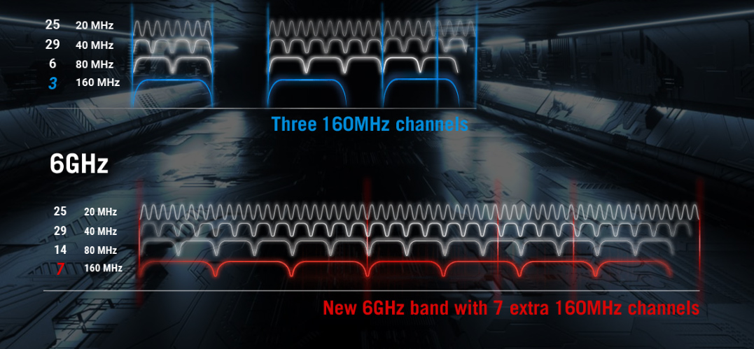 - Dải tần số 6 GHz mới - Kênh rộng và dung lượng cao cung cấp hiệu suất cao hơn, độ trễ thấp hơn và ít nhiễu hơn.