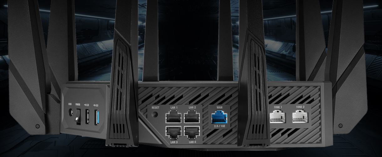 ROG Rapture GT-AXE16000 có hai cổng WAN / LAN kép 10 Gbps, bốn cổng LAN 1 Gbps và một cổng WAN 2.5 Gbps. Điều này giúp bạn có khả năng cung cấp băng thông lớn đến các thiết bị có dây và tận dụng các kết nối internet siêu tốc trong mọi tình huống.