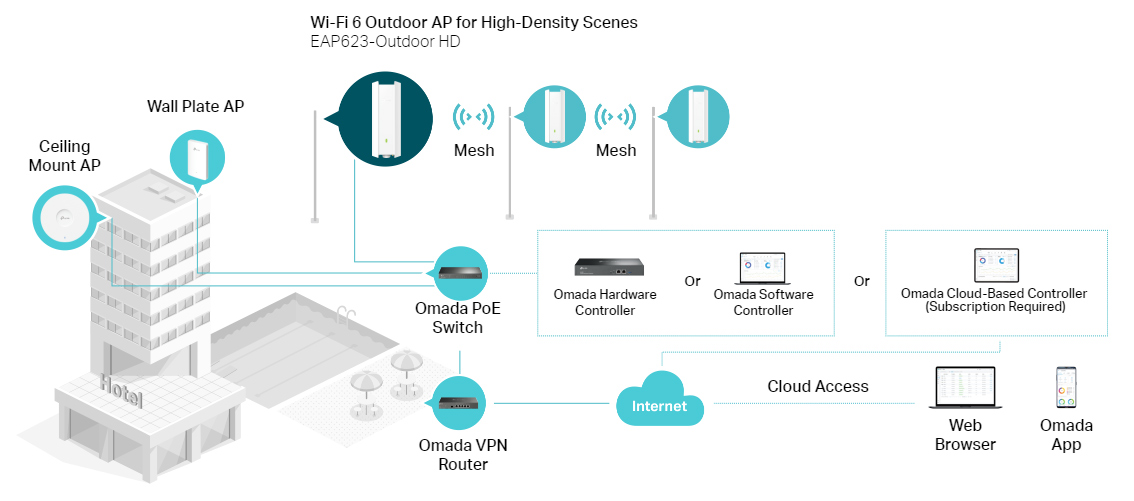 △ Omada Mesh, Seamless Roaming, Cloud Access và Captive Portal yêu cầu sử dụng bộ điều khiển Omada SDN. Truy cập Danh sách sản phẩm Omada Mesh để tìm tất cả các model được công nghệ Omada Mesh hỗ trợ và tham khảo Hướng dẫn sử dụng Bộ điều khiển Omada SDN để biết phương pháp cấu hình.