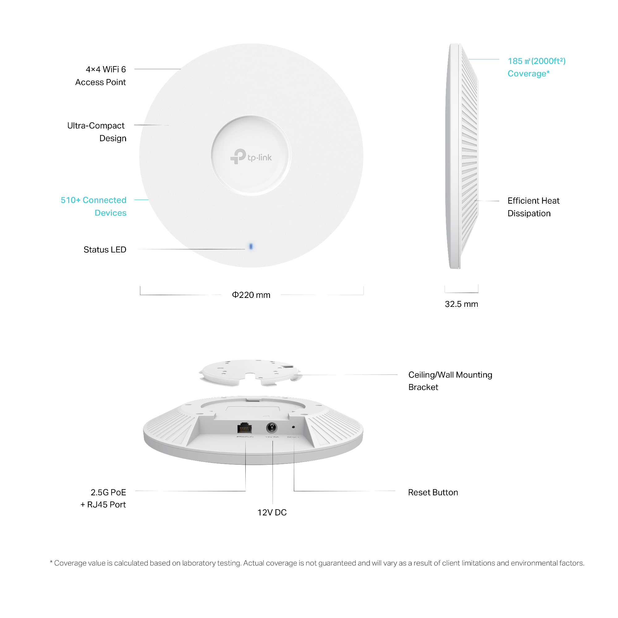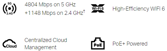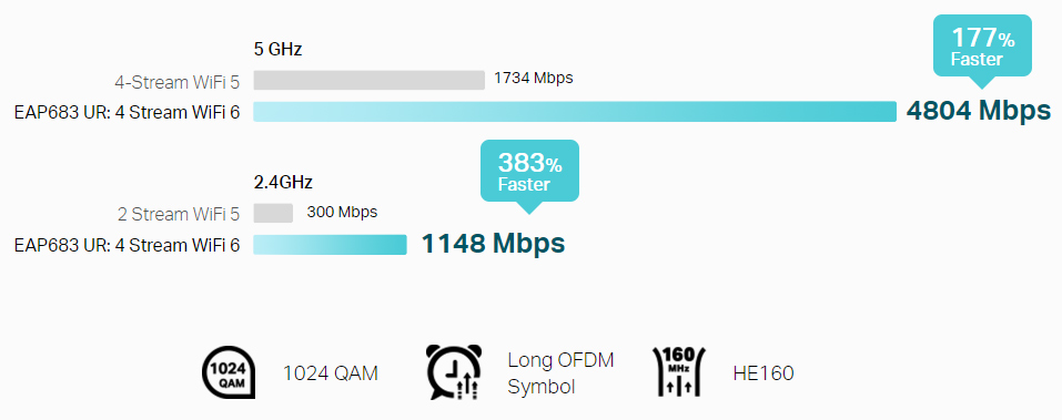 ‡Việc sử dụng WiFi 6 (802.11ax) và các tính năng của nó, bao gồm OFDMA, HE160 và 1024-QAM, yêu cầu khách hàng phải hỗ trợ các tính năng tương ứng. Băng thông 160 MHz chỉ khả dụng trên băng tần 5 GHz. Nó có thể không có sẵn ở một số vùng/quốc gia do các hạn chế về quy định. Độ rộng kênh đôi đề cập đến 160 MHz, so với 80 MHz đối với các AP WiFi 6 thông thường.