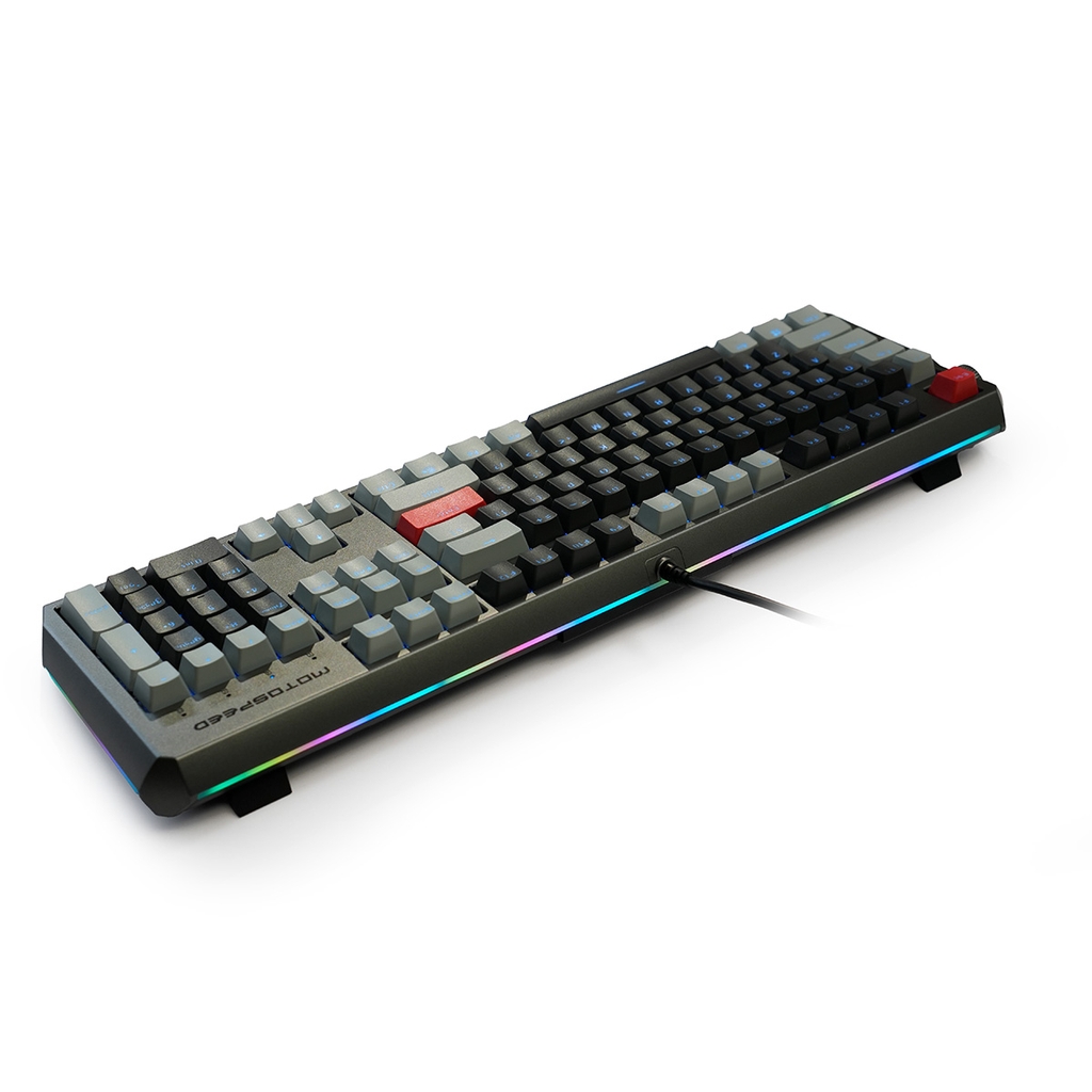 Motospeed CK80 RGB có thiết kế 104 phím cơ tiêu chuẩn, chip trò chơi tích hợp, công nghệ chuyển đổi cơ học tiên tiến, mang lại cho bạn cảm giác dễ chịu hơn khi sử dụng, cho trải nghiệm hoàn hảo tối đa. Nút xoay ở bên cạnh bàn phím với chức năng điều chỉnh cả âm lượng và độ sáng ánh sáng, cho phép bạn thực hiện toàn bộ lệnh của bàn phím bằng một ngón tay.