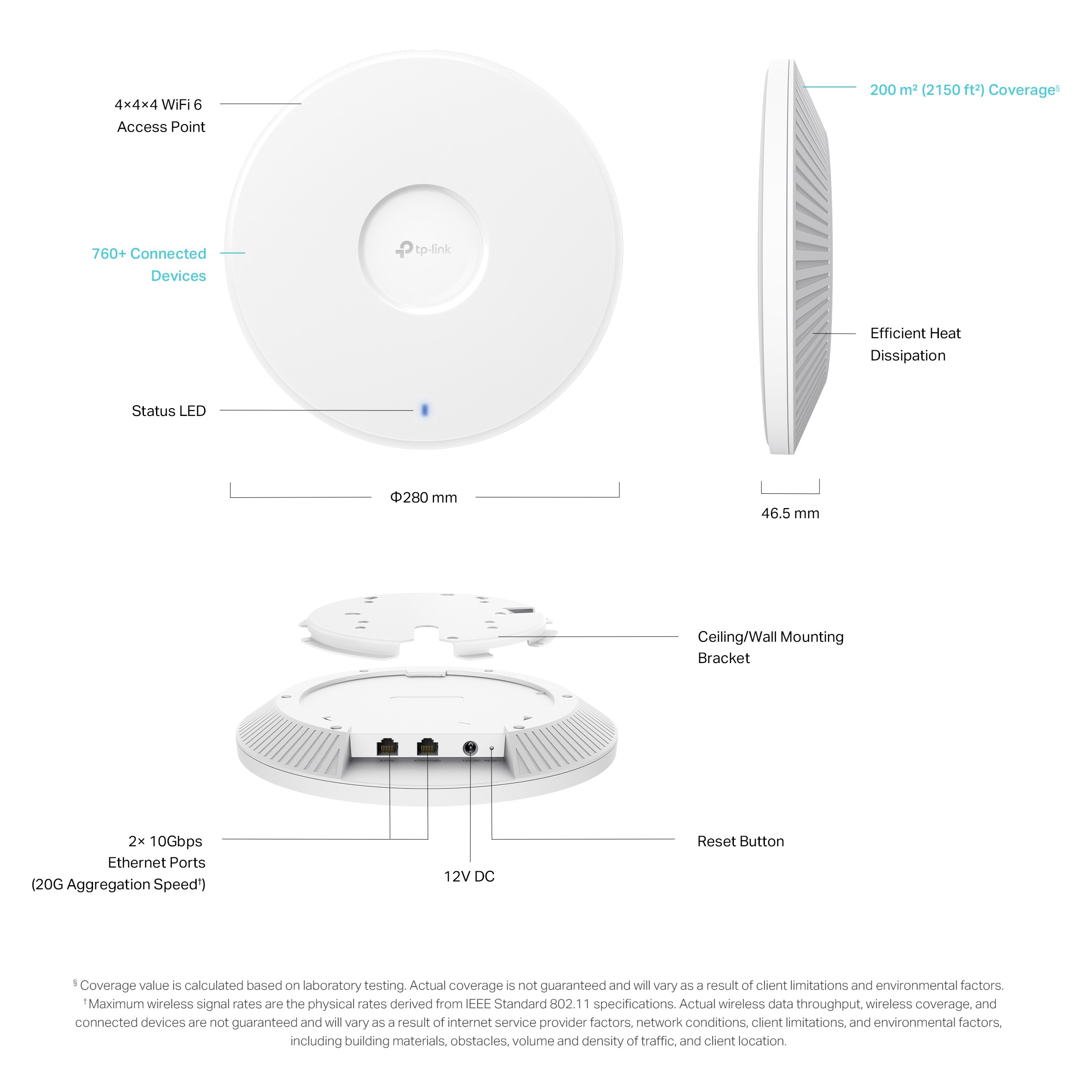 †Tốc độ tín hiệu không dây tối đa là tốc độ vật lý bắt nguồn từ thông số kỹ thuật của Tiêu chuẩn IEEE 802.11. Băng thông 320 MHz chỉ khả dụng trên băng tần 6 GHz. Đồng thời, băng thông 320 MHz trên băng tần 6 GHz và băng thông 160 MHz trên băng tần 5 GHz có thể không khả dụng ở một số vùng/quốc gia do các hạn chế về quy định. Độ rộng và tốc độ kênh đôi đề cập đến 320 MHz so với 160 MHz đối với bộ định tuyến WiFi 6. Thông lượng dữ liệu không dây thực tế, phạm vi phủ sóng không dây và các thiết bị được kết nối không được đảm bảo và sẽ thay đổi tùy theo các yếu tố của nhà cung cấp dịch vụ internet, điều kiện mạng, giới hạn của khách hàng và các yếu tố môi trường, bao gồm vật liệu xây dựng, chướng ngại vật, khối lượng và mật độ lưu lượng truy cập cũng như khách hàng. vị trí.