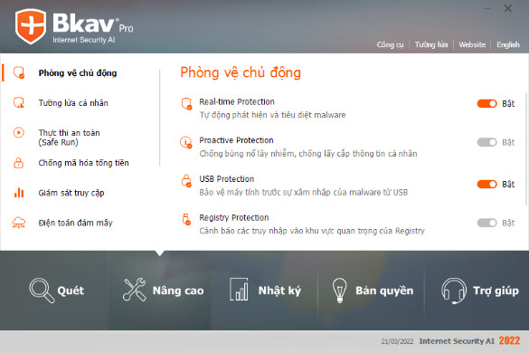 Bkav Pro - Sử dụng Trí tuệ nhân tạo (AI), tích hợp công nghệ điện toán đám mây, bảo vệ đa lớp giúp ngăn chặn mọi nguy cơ trên Internet, Diệt virus, Chống phần mềm gián điệp, Bảo vệ dữ liệu, Tài khoản ngân hàng, Bảo vệ mật khẩu…