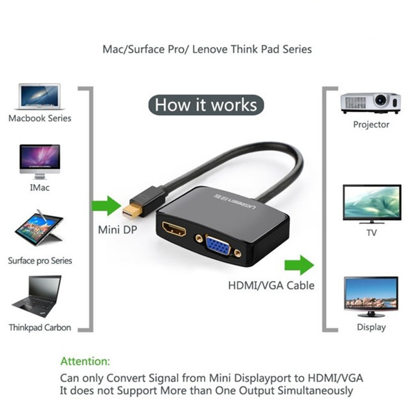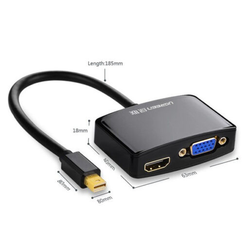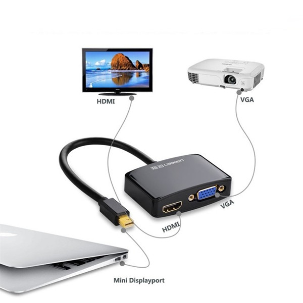 Bộ chuyển đổi có chipset Mini DisplayPort sang VGA + HDMI VGA Ugreen 10439 cho phép bạn mở rộng hiển thị từ màn hình của máy tính của bạn bằng một giao diện HDMI hay VGA. Cáp chuyển đổi Thunderbolt to HDMI và VGA dùng cho Dell, Surface pro, HP, MacBook, MacBook Pro, hay MacBook Air có hỗ trợ cổng với một cáp Mini DisplayPort sang HDMI hoặc VGA xuất ra tivi hay máy chiếu với độ phân giải hình ảnh sắc nét sống động.