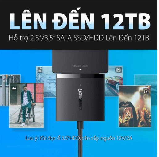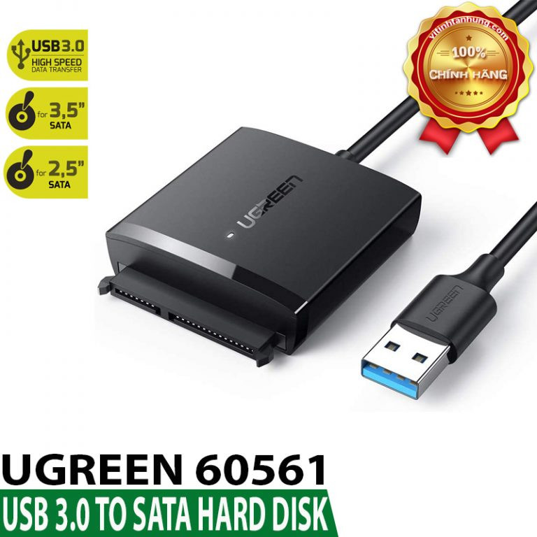 Cáp chuyển đổi USB 3.0 sang SATA Ugreen 60561 kết nối từ USB 3.0 với ổ cứng SATA 2.5”/3.5” thành ổ cứng đi động và đọc được dữ liệu ổ cứng lên đến 12TB