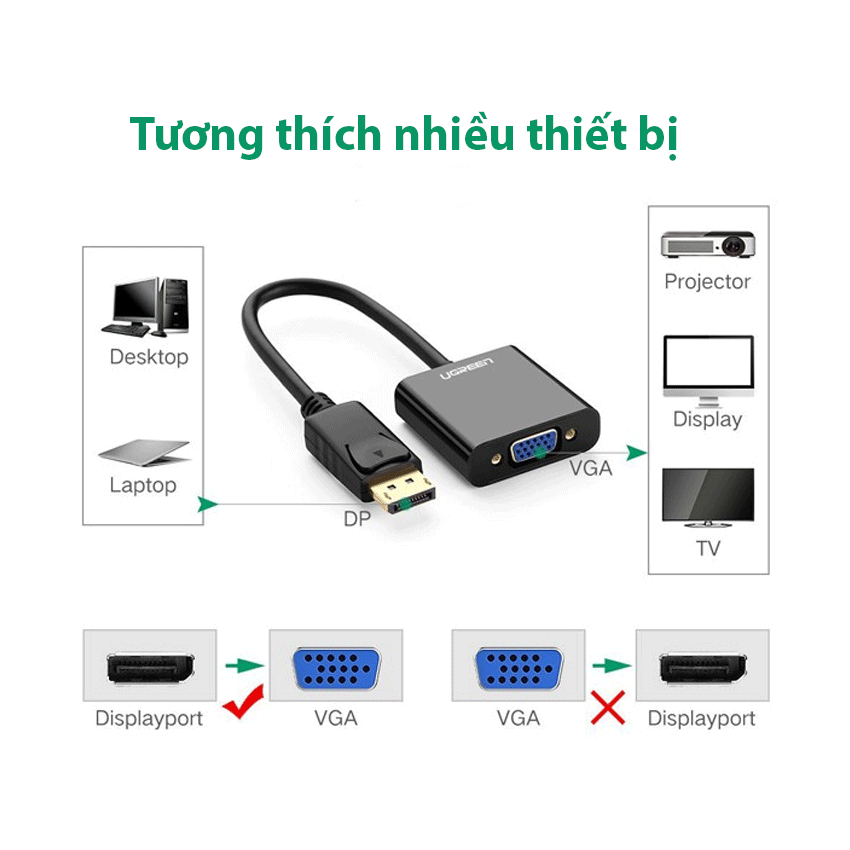 Bộ chuyển đổi DisplayPort sang VGA màu đen Ugreen 20415 là phụ kiện chính hãng giúp bạn dễ dàng kết nối một máy tính, laptop … có cổng Displayport của bạn với màn hình máy tính, máy chiếu và các thiết bị trình chiếu khác qua chuẩn giao tiếp VGA. Mang đến trải nghiệm hình ảnh sống động, sắc nét nhất.