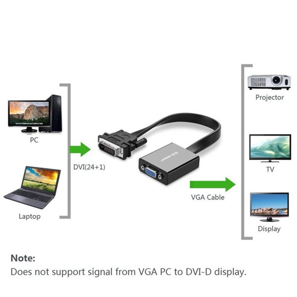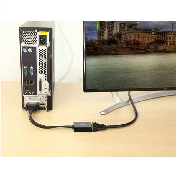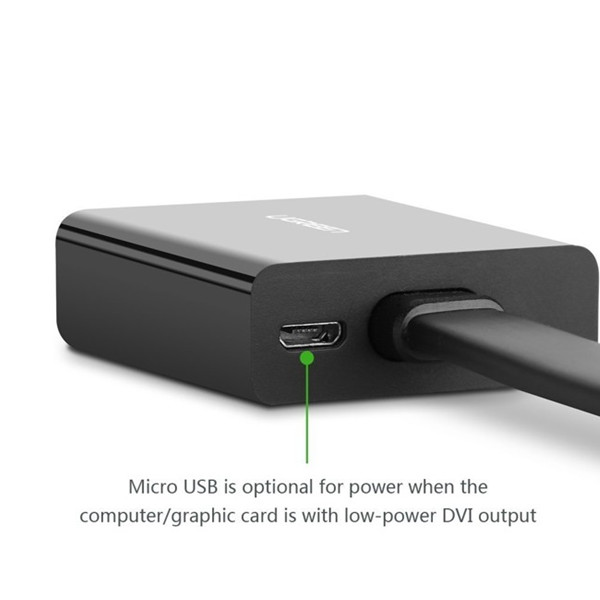 Bộ chuyển đổi DVI-D sang VGA active Ugreen 40259 kết nối một máy tính để bàn hoặc máy tính xách tay với một DVI 24 + 5 Analog Video Card với một HDTV, Moniter, máy chiếu hoặc hiển thị với cổng VGA với độ phân giải lên đến 1080p.