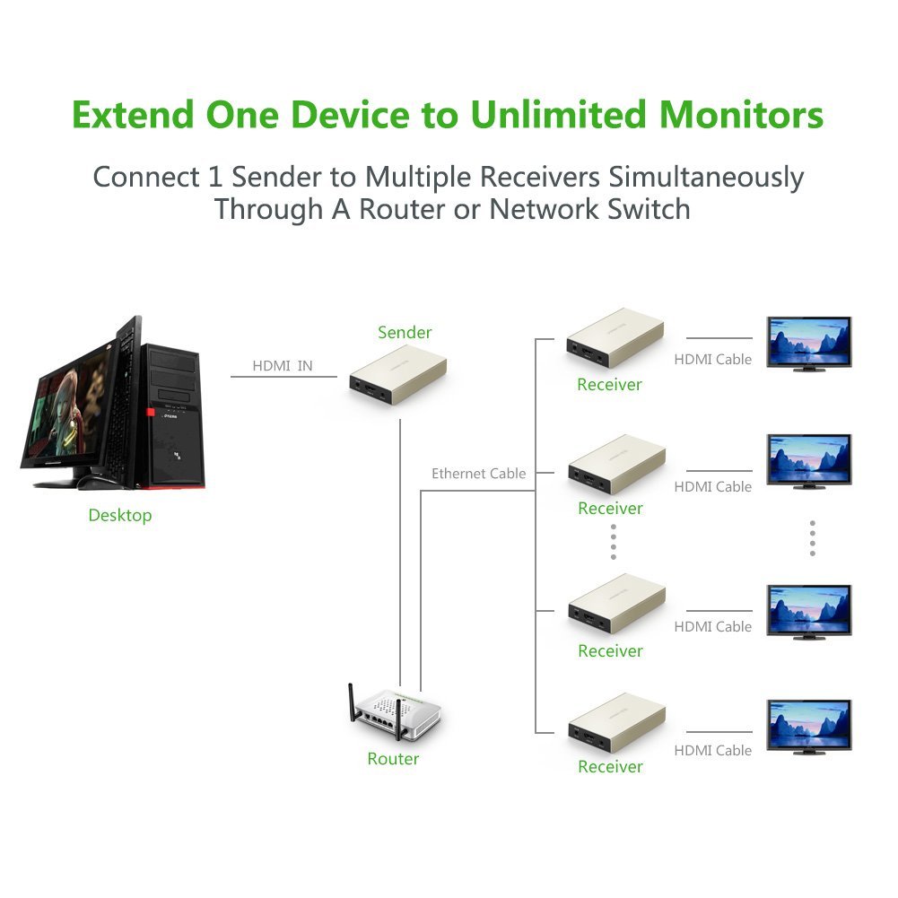 Bộ chuyển đổi HDMI ra dây mạng Cat5e/6 Udreen 40280 hoạt động trên mô hình NHẬN-PHÁT qua giao thức TCP-IP Ugreen 40280 là thiết bị phát HDMI (Sender), và có thể truyền tín hiệu một lần nhiều thiết bị nhận thông qua một router switch mạng (bộ chuyển mạch).