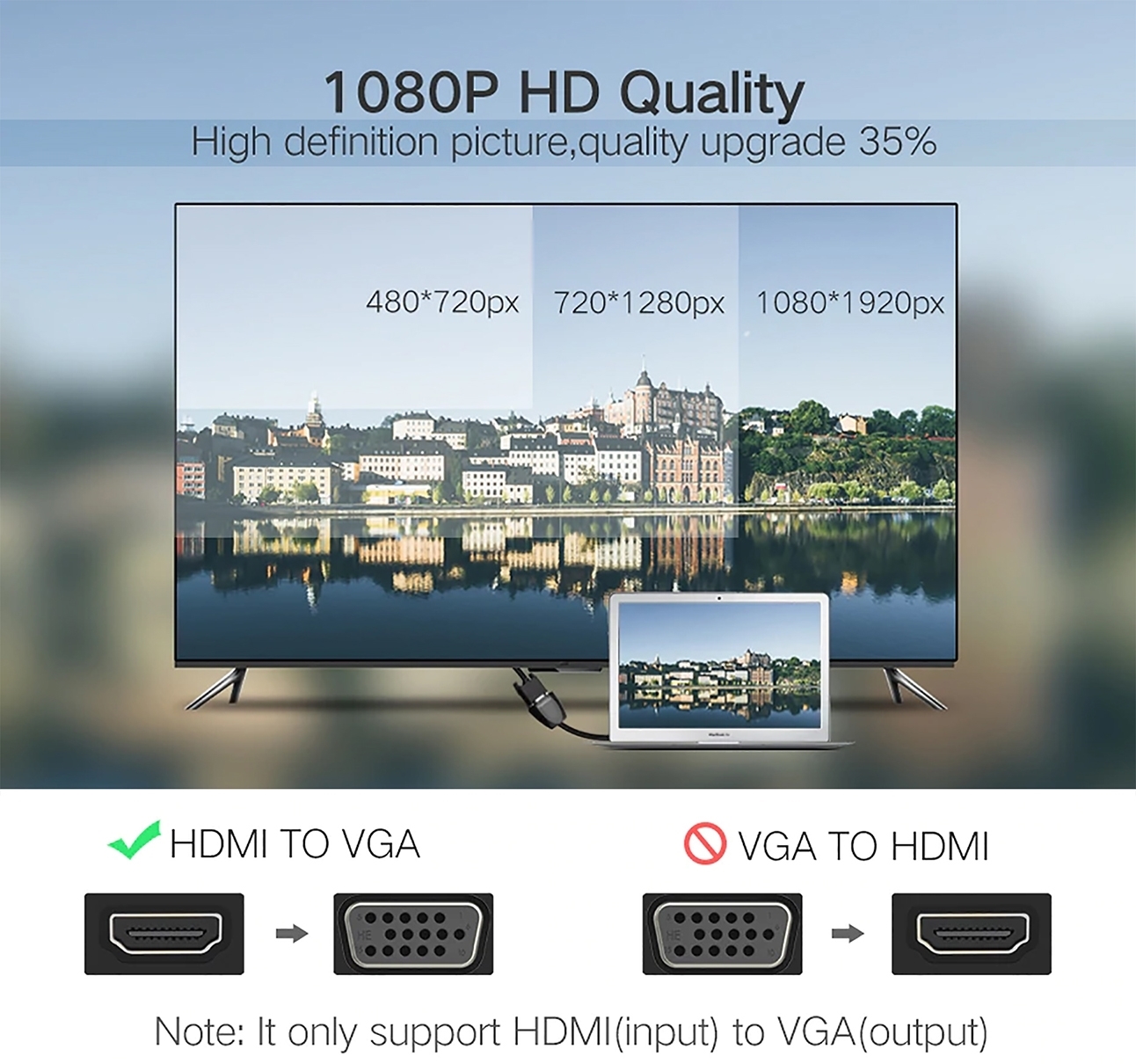 Bộ chuyển đổi HDMI sang VGA màu đen Ugreen 40253 với chipset tích hợp, chuyển đổi tín hiệu HDMI kỹ thuật số sang tín hiệu VGA analog. Cáp chuyển đổi này chỉ chuyển tín hiệu từ các thiết bị nguồn HDMI để hiển thị trên máy chiếu VGA hoặc màn hình. Cáp chuyển HDMi sang vga của Ugreen khác với một sản phẩm HDMI sang VGA cao cấp trước đây là có thể truyền tải được cả âm thanh. Nhưng sản phẩm lần này chỉ cho phép truyền tải hình ảnh. Do vậy giá thành cũng rẻ hơn khá nhiều so với các sản phẩm trước đây.