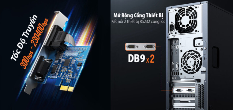 Card chuyển PCI-E sang cổng RS 232 Ugreen 80116 phù hợp để trang bị thêm cho PC của bạn, mở rộng 2 cổng Com để kết nối với các thiết bị lập trình, máy in,…. Tốc độ truyền tải cao có thể đạt từ 300bps – 230400bps.