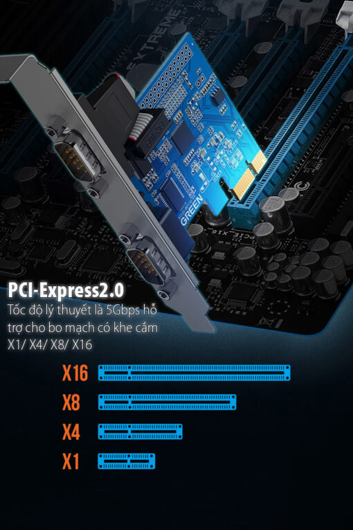 Tiêu chuẩn PCI-Express 2.0, tốc độ truyền lý thuyết là 5Gbps. Hỗ trợ việc sử dụng bo mạch chủ có khe cắm thẻ x1/ x4/ x8/ x16.