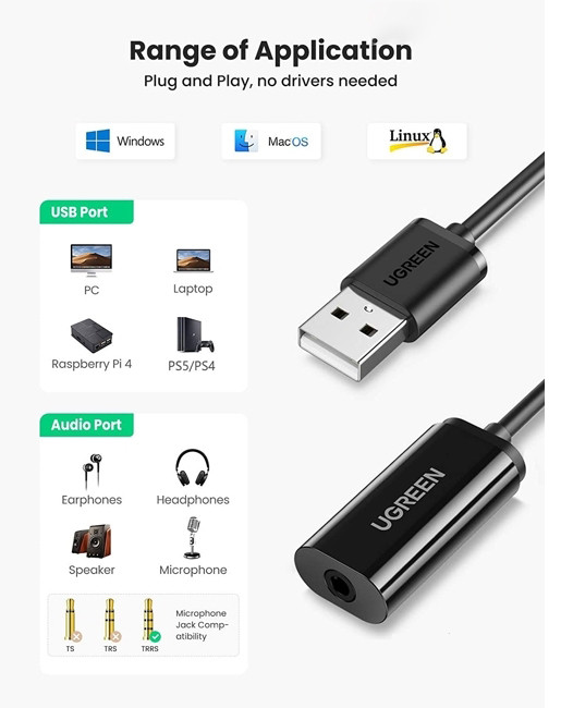 Usb Sound Ugreen 10330 là phụ kiện cao cấp giúp bạn dễ dàng thêm một cổng audio TRRS 3,5mm (chuẩn kết nối 3.5mm tích hợp cả mic và loa chỉ với 1 jack cắm 3.5mm), giúp bạn kết nối tai nghe của bạn với máy tính thông qua một cổng USB duy nhất.