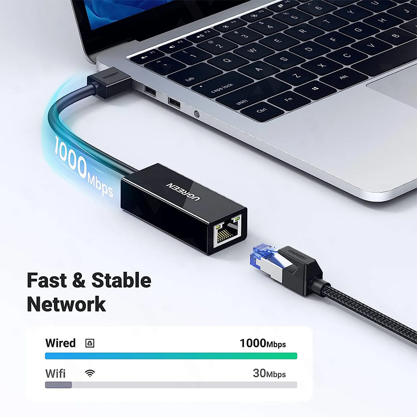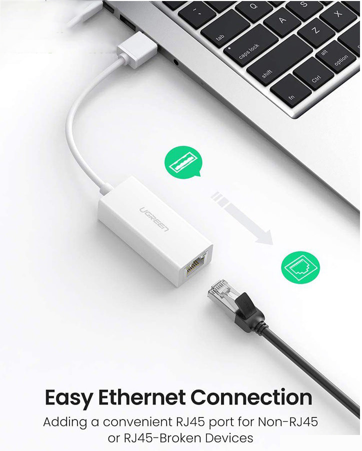 Bộ chuyển đổi USB 3.0 Giga Lan Card Ugreen 20255 và Bộ chuyển đổi USB 3.0 Giga Lan Card, vỏ ABS đen Ugreen 20256 là phụ kiện cao cấp dùng để thay thế cổng mạng lan bị hỏng hoặc sử dụng cho các thiết bị không tích hợp cổng RJ45 như Macbook, v.v. Là thiết bị chuyển đổi USB 3.0 sang Lan tích hợp công nghệ Full/Half Duplex (Công nghệ truyền tìn hiệu bán song công và toàn song công) hỗ trợ các chuẩn mạng IEE802.3, 802.3u (10Base-T, 100Base-T), công thêm tính năng Plug and Play (Cắm là nhận) đảm bảo khả năng tương thích tối đa của thiết bị. Hỗ trợ hầu hết các hệ điều hành máy tính mà không cần cài đặt trình điều khiển driver khi sử dụng thiết bị.