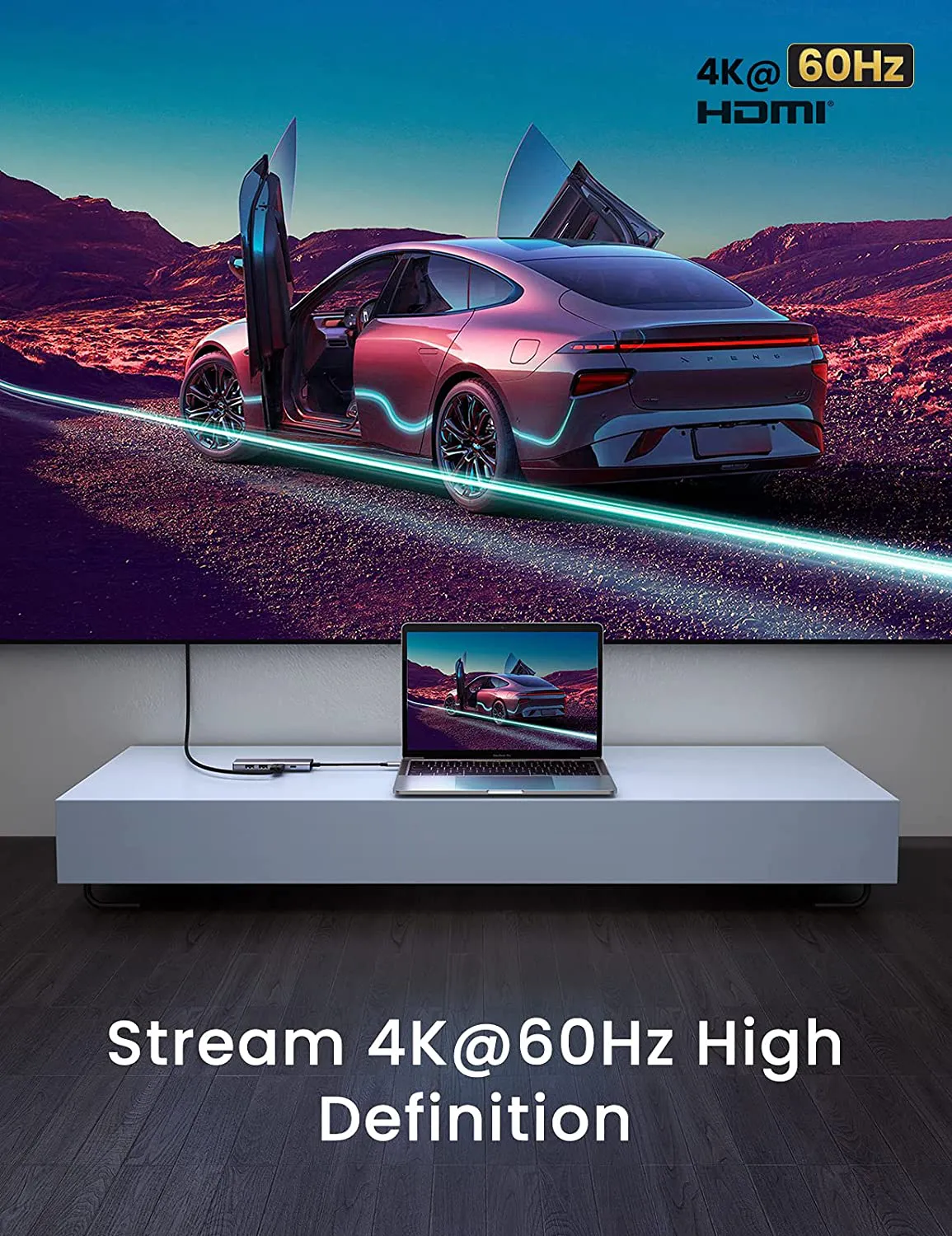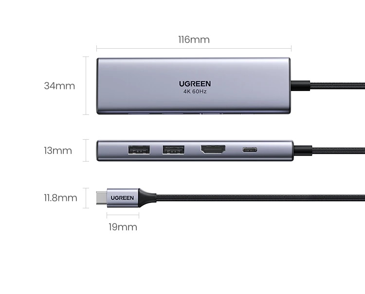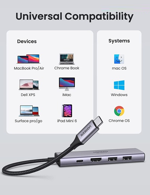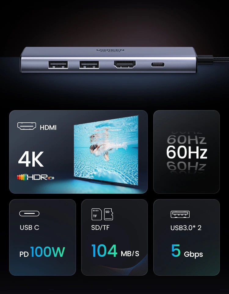 Bộ chuyển đổi USB-C sang 2*USB 3.0 + HDMI SD TF và PD hỗ trợ 4K Ugreen 60384 giúp bạn dễ dàng kết nối Macbook, Laptop cổng USB-C của bạn với màn hình HDTV, máy chiếu … v.v. hỗ trợ độ phân giải cao lên đến 4K*2K@60Hz mang đến trải nghiệm hình ảnh, âm thanh sống động.