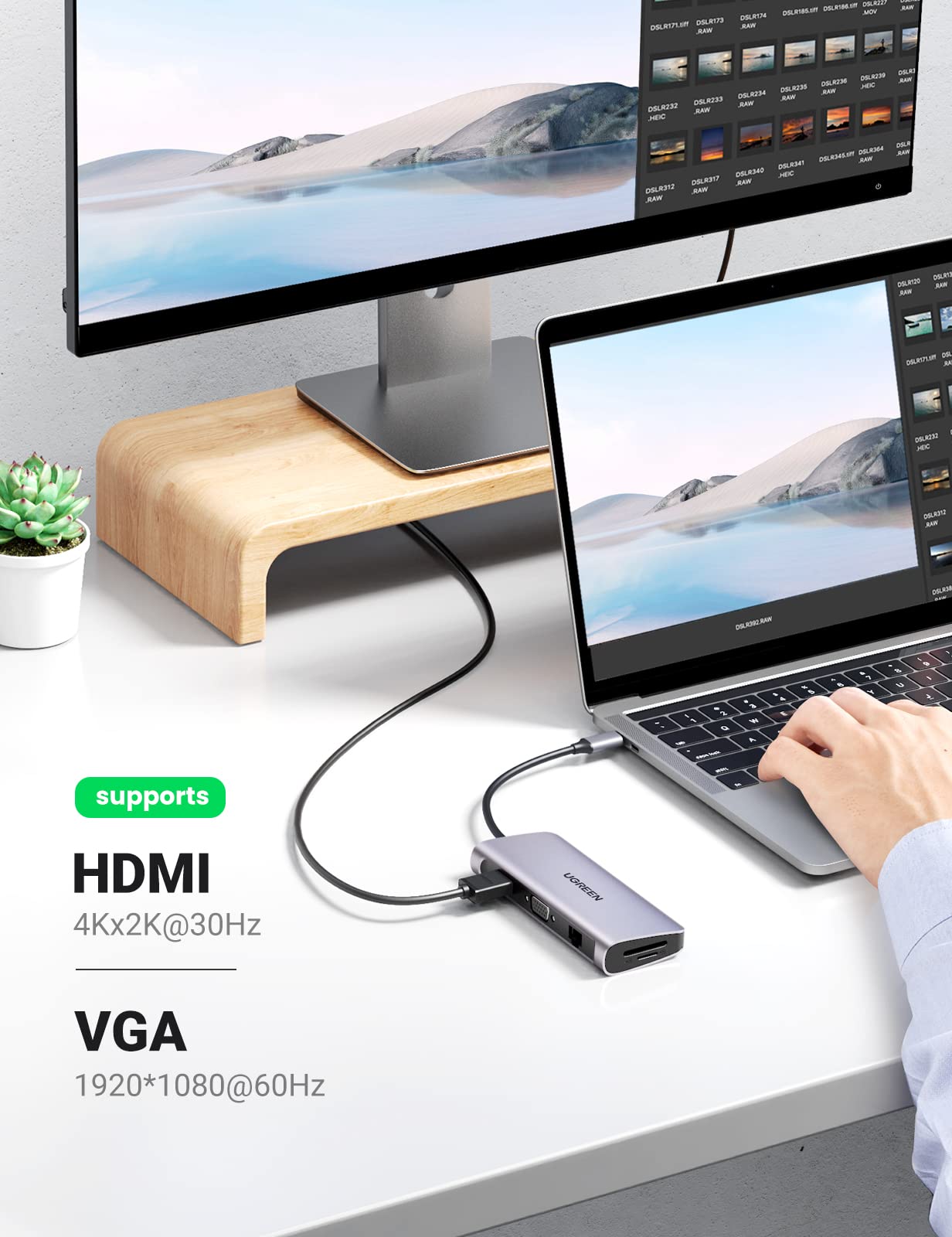 USB C to VGA: Bộ chuyển đổi USB-C đa năng Ugreen 80133 còn hỗ trợ cổng kết nối VGA độ phân giải FullHD 1920x1080P@60Hz giúp bạn dễ dàng kết nối chia sẻ hình ảnh từ máy tính với máy chiếu, màn hình chuẩn VGA. Với thiết bị này bạn có thể sử dụng với hầu hết các chuẩn màn hình hiện nay.