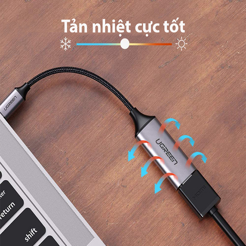 Bộ chuyển đổi USB-C sang HDMI Ugreen 70444 thiết kế vỏ nhôm màu Gray sang trọng và tinh tế, chất liệu cao cấp này còn giúp cho thiết bị có khả năng tản nhiệt tốt hơn, mang đến độ bền cao nhất.