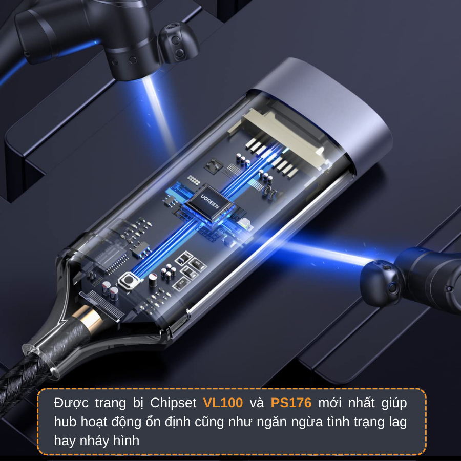 Bộ chuyển đổi USB-C sang HDMI Ugreen 70444 được trang bị Chipset VL100 và PS176 tiên tiến giúp đảm bảo đường truyền tín hiệu luôn ổn định cũng như ngăn ngừa tình trạng lag hay nháy hình.