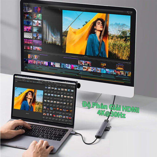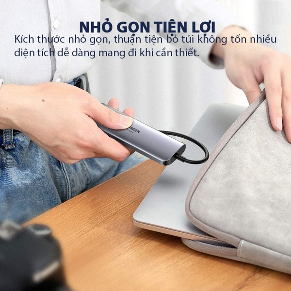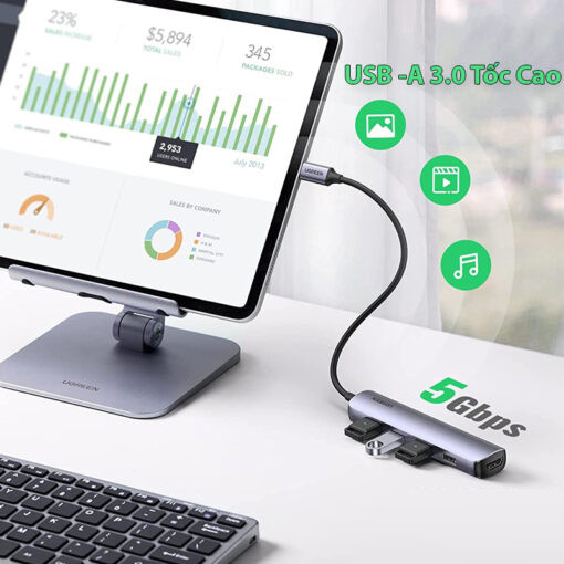 Bộ chuyển đổi USB Type-C sang HDMI kèm 4 hub USB 3.0 Ugreen 20197 giúp bạn dễ dàng kết nối Macbook, Laptop cổng USB-C của bạn với màn hình HDTV, máy chiếu. v.v. Hỗ trợ độ phân giải cao lên đến 4K*2K@30Hz mang đến trải nghiệm hình ảnh, âm thanh sống động. Bộ chuyển USB-C Ugreen 20197 còn hỗ trợ 4 cổng USB 3.0 tốc độ cao dùng để kết nối các thiết bị ngoại vi như chuột, bàn phím, ổ cứng di động… với tốc độ truyền tải tín hiệu số lên đến 5Gbps.