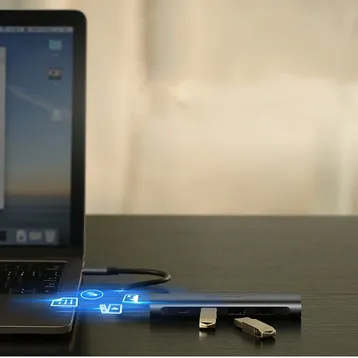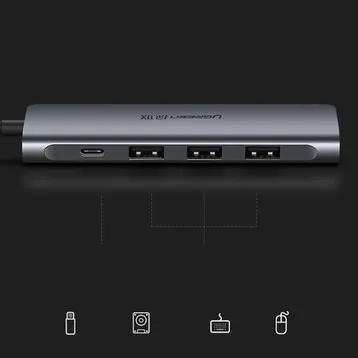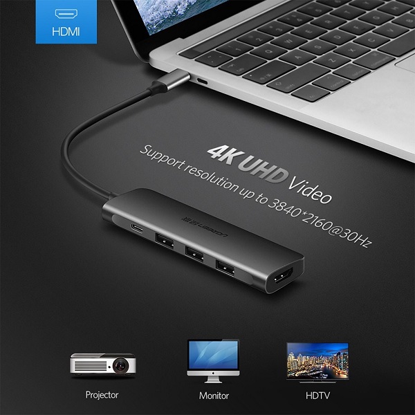 Bộ chuyển đổi USB Type-C sang HDMI + USB 3.0*3 + PD Ugreen 50209 giúp bạn dễ dàng kết nối Macbook, Laptop cổng USB-C của bạn với màn hình HDTV, máy chiếu, vv. hỗ trợ độ phân giải cao lên đến 4K*2K@30Hz mang đến trải nghiệm hình ảnh, âm thanh sống động. Bộ chuyển USB-C Ugreen 50209 còn hỗ trợ 3 cổng USB 3.0 tốc độ cao dùng để kết nối các thiết bị ngoại vi như chuột, bàn phím, ổ cứng di động… với tốc độ truyền tải tín hiệu số lên đến 5Gbps. Ngoài ra, phụ kiện cao cấp này còn tích hợp thêm 1 cổng USB-C hỗ trợ công nghệ sạc PD giúp bạn có thể sạc, cấp nguồn ngay trên thiết bị, không ngại thiếu cổng kết nối.