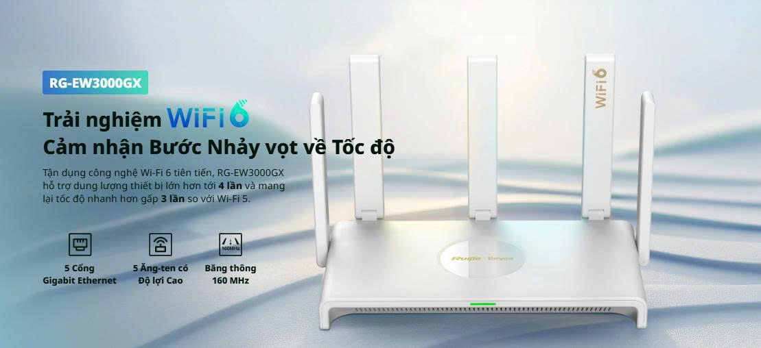 Router RG-EW3000GX là một sản phẩm hiện đại sử dụng công nghệ Wi-Fi 6 (802.11ax), mang lại khả năng kết nối mạng mạnh mẽ và ổn định
