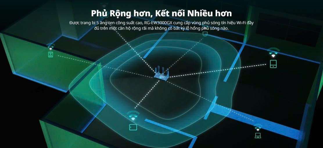 Được trang bị 5 ăng-ten công suất cao, RG-EW3000GX cung cấp vùng phủ sóng tín hiệu Wi-Fi đầy đủ trên một căn hộ rộng rãi mà không có bất kỳ lỗ hổng phủ sóng nào.