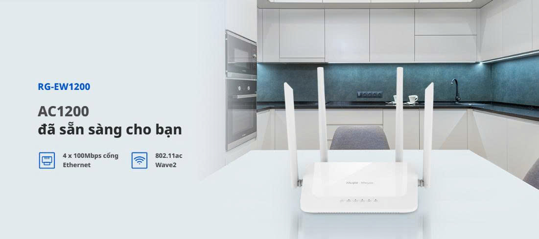 RUIJIE RG-EW1200 là dòng sản phẩm Router Wifi cho gia đình chất lượng, chính hãng. RG-EW1200 một bộ định tuyến không dây băng tần kép 1200M, được thiết kế đặc biệt cho căn hộ, nhà ở tự xây dựng, cửa hàng bán lẻ nhỏ và các trường hợp khác.
