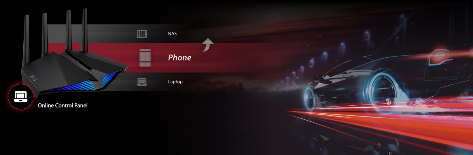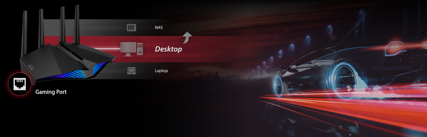 Cổng chuyên game trên RT-AX82U tự động ưu tiên mọi thiết bị có dây được kết nối. Không cần cấu hình phức tạp, chỉ cần kết nối PC hoặc máy chơi game của bạn với cổng LAN đặc biệt, cho bạn kết nối nhanh, ổn định và luôn chiếm ưu thế về tốc độ.