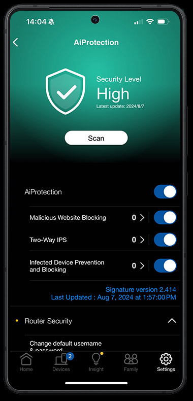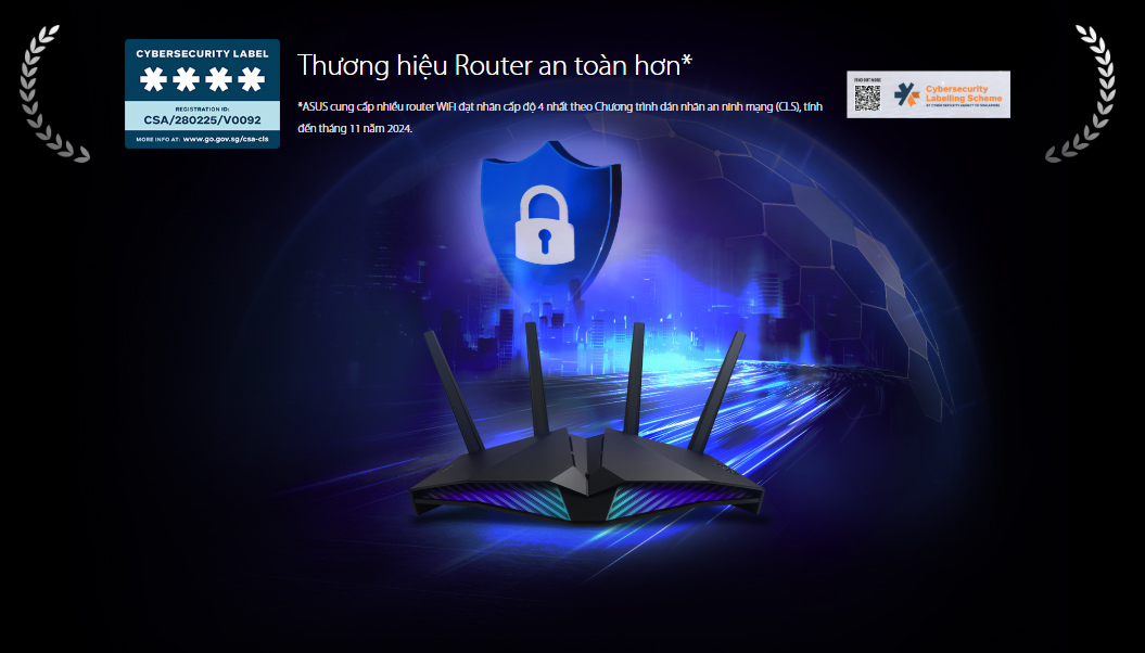 Công nghệ ASUSWRT 4.0 mới nhất nâng cao khả năng bảo mật và quyền riêng tư cho mạng của bạn, tất cả đều có thể quản lý thông qua ứng dụng di động ASUS Router tiện dụng. Ứng dụng này có tính năng kiểm soát dành cho phụ huynh tiên tiến, bao gồm Reward Time (Thời gian thưởng), Quét bảo mật một chạm, Duyệt an toàn trực quan và các tính năng VPN tích hợp toàn diện. Router ASUS được kiểm tra thử nghiệm nghiêm ngặt để đảm bảo tính bảo mật mạnh mẽ và đã nhận được các chứng chỉ quốc tế, bao gồm Chương trình dán nhãn an ninh mạng (Cybersecurity Labelling Scheme - CLS) của Cơ quan An ninh mạng Singapore (Cyber Security Agency of Singapore - CSA).