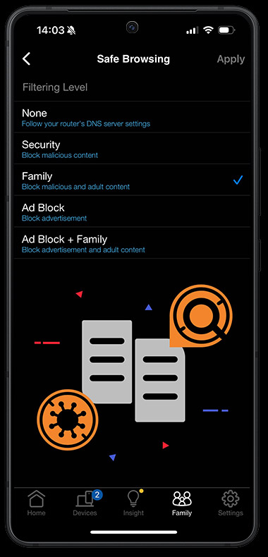 Tùy chỉnh chế độ bảo vệ cho từng người dùng hoặc một nhóm thiết bị bằng bộ lọc an toàn để bảo vệ các hoạt động trực tuyến của bạn. AdGuard DNS cung cấp tính năng chặn quảng cáo và bảo vệ quyền riêng tư để giúp chặn quảng cáo.